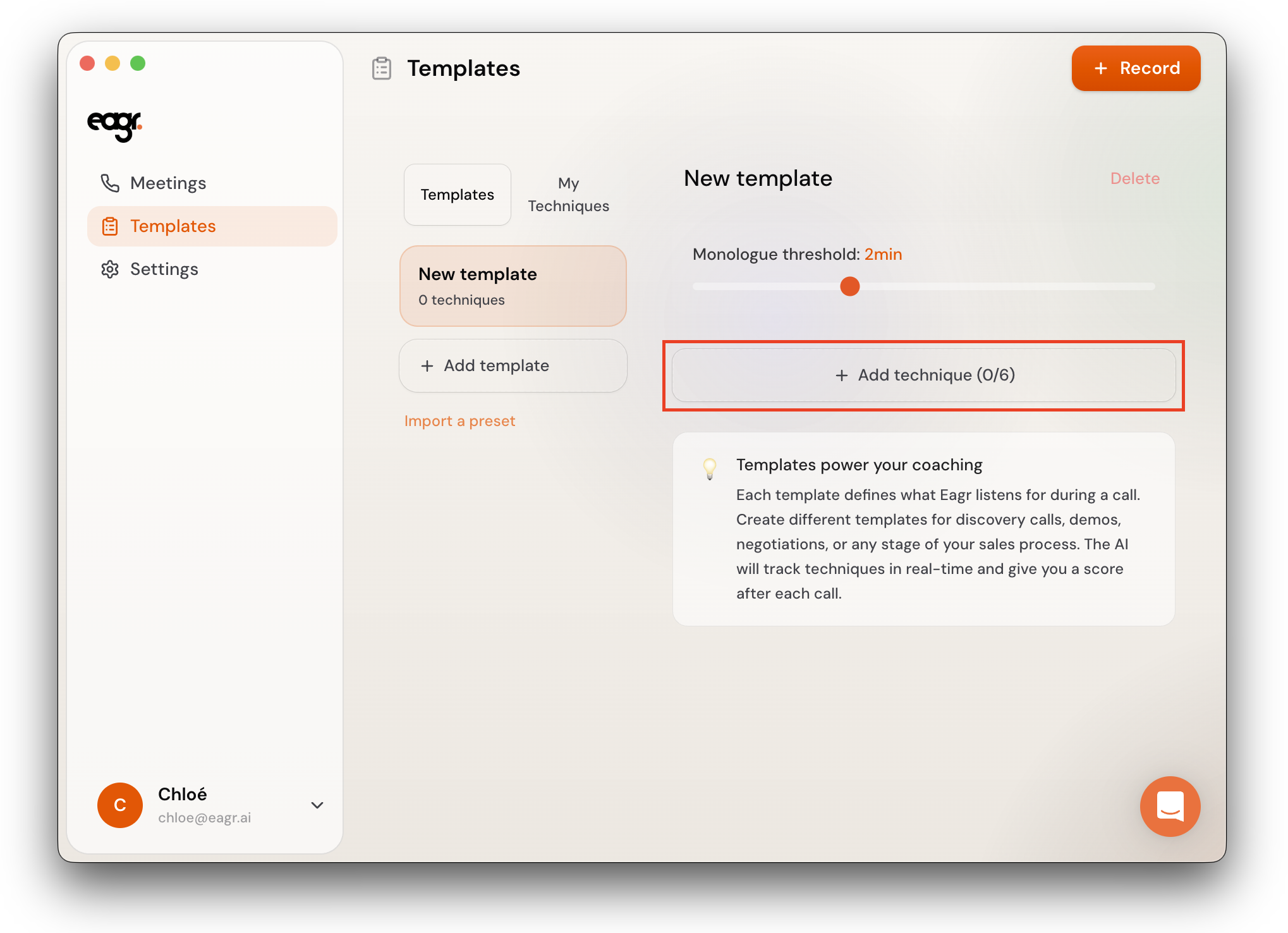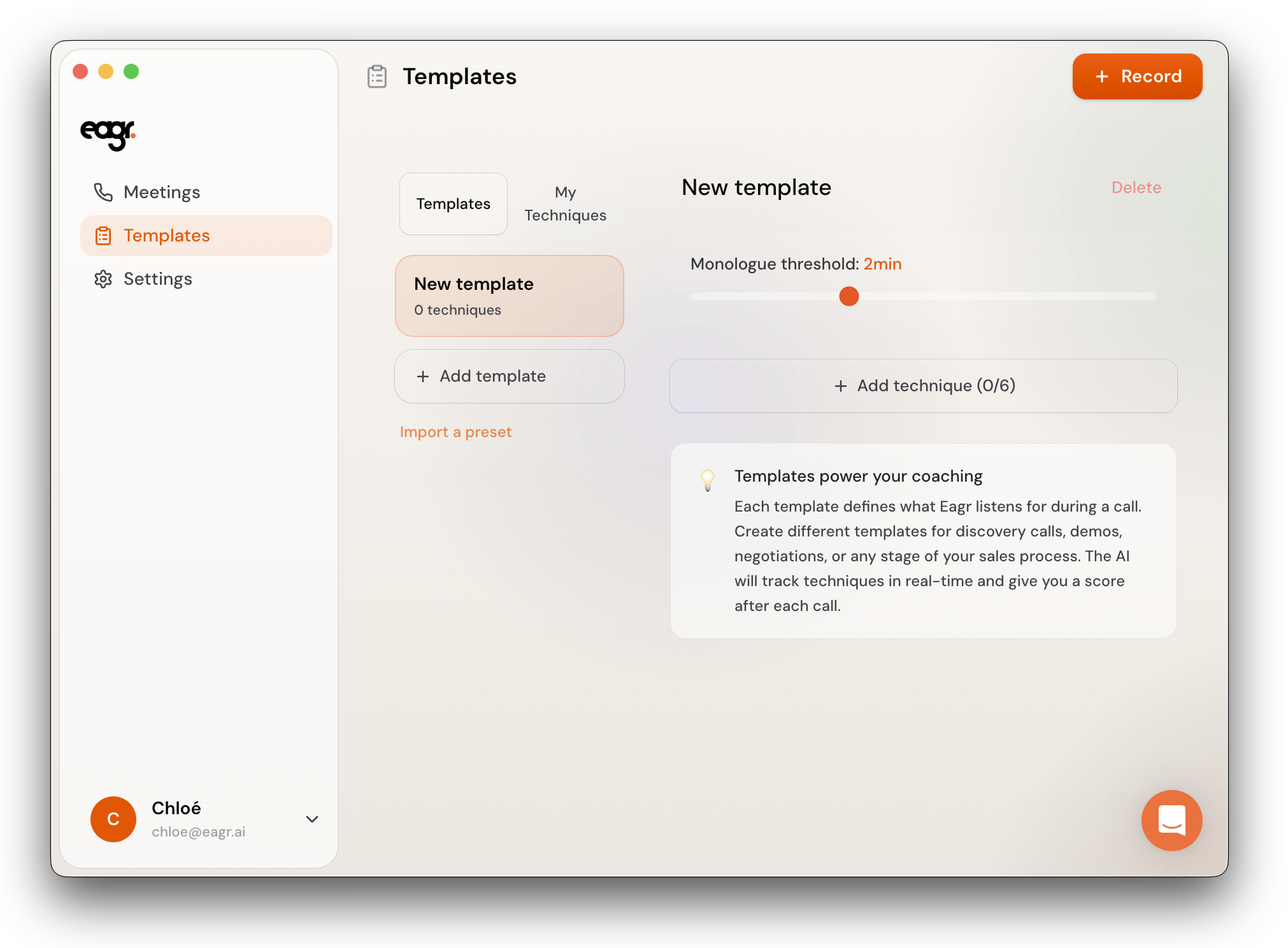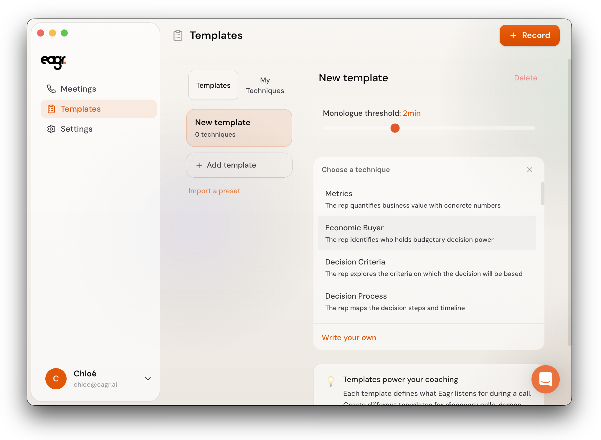 A template is a set of sales techniques that the Live Coach tracks during your calls. Each template defines what Eagr listens for — and you can create different templates for different types of calls (discovery, demo, negotiation, etc.).