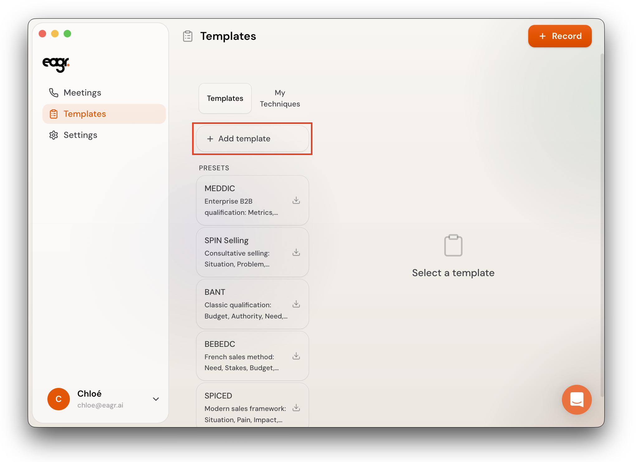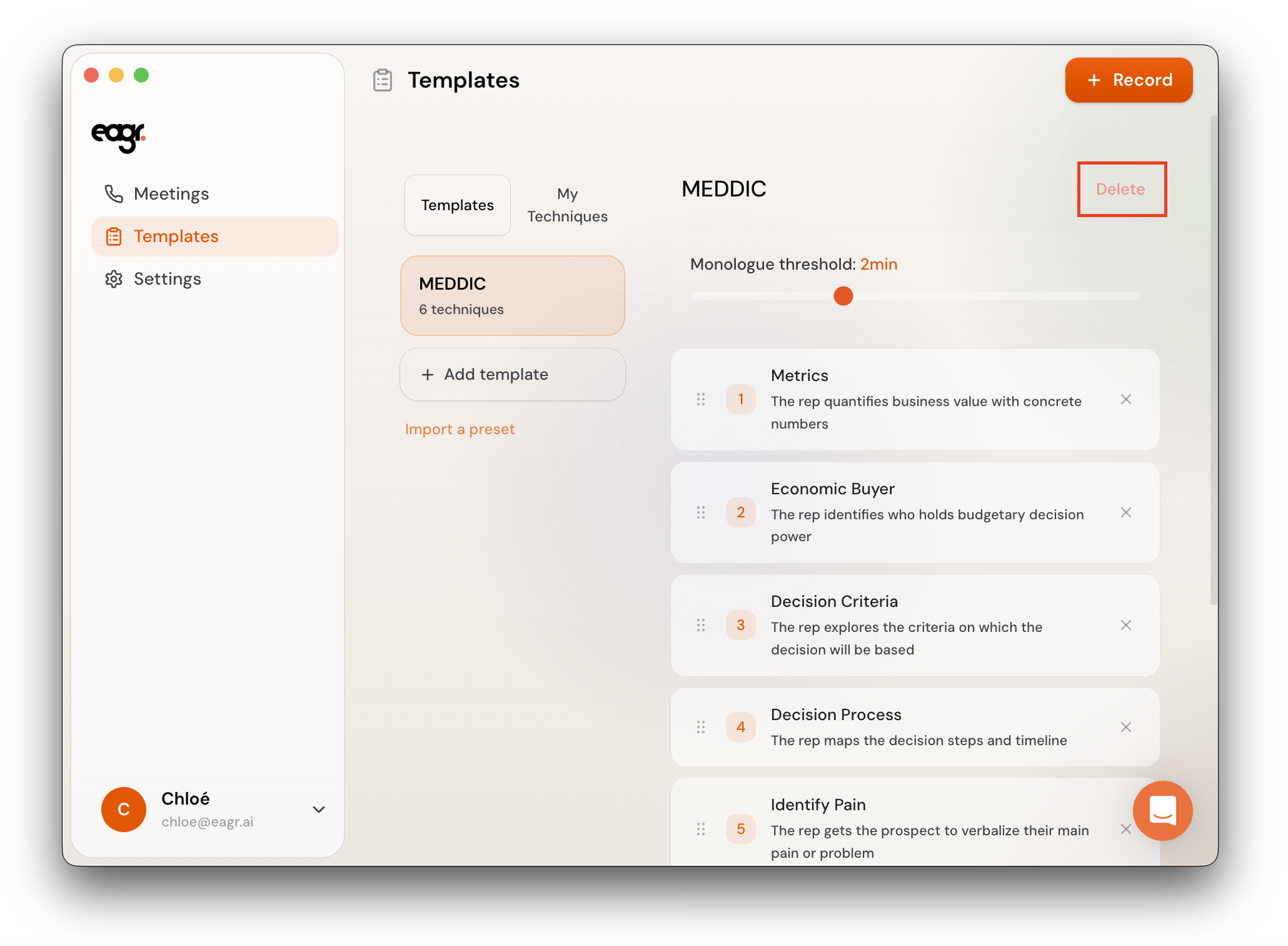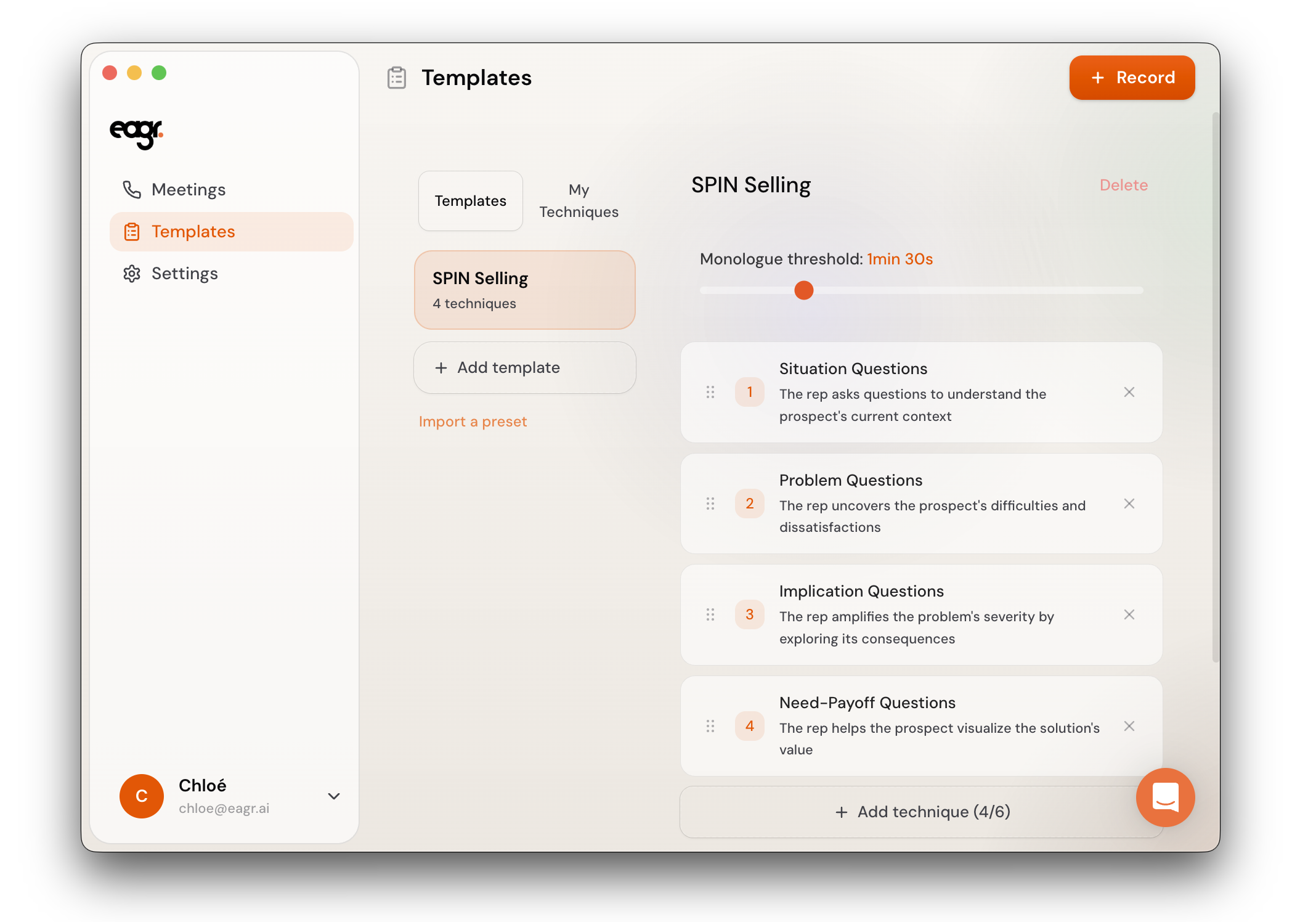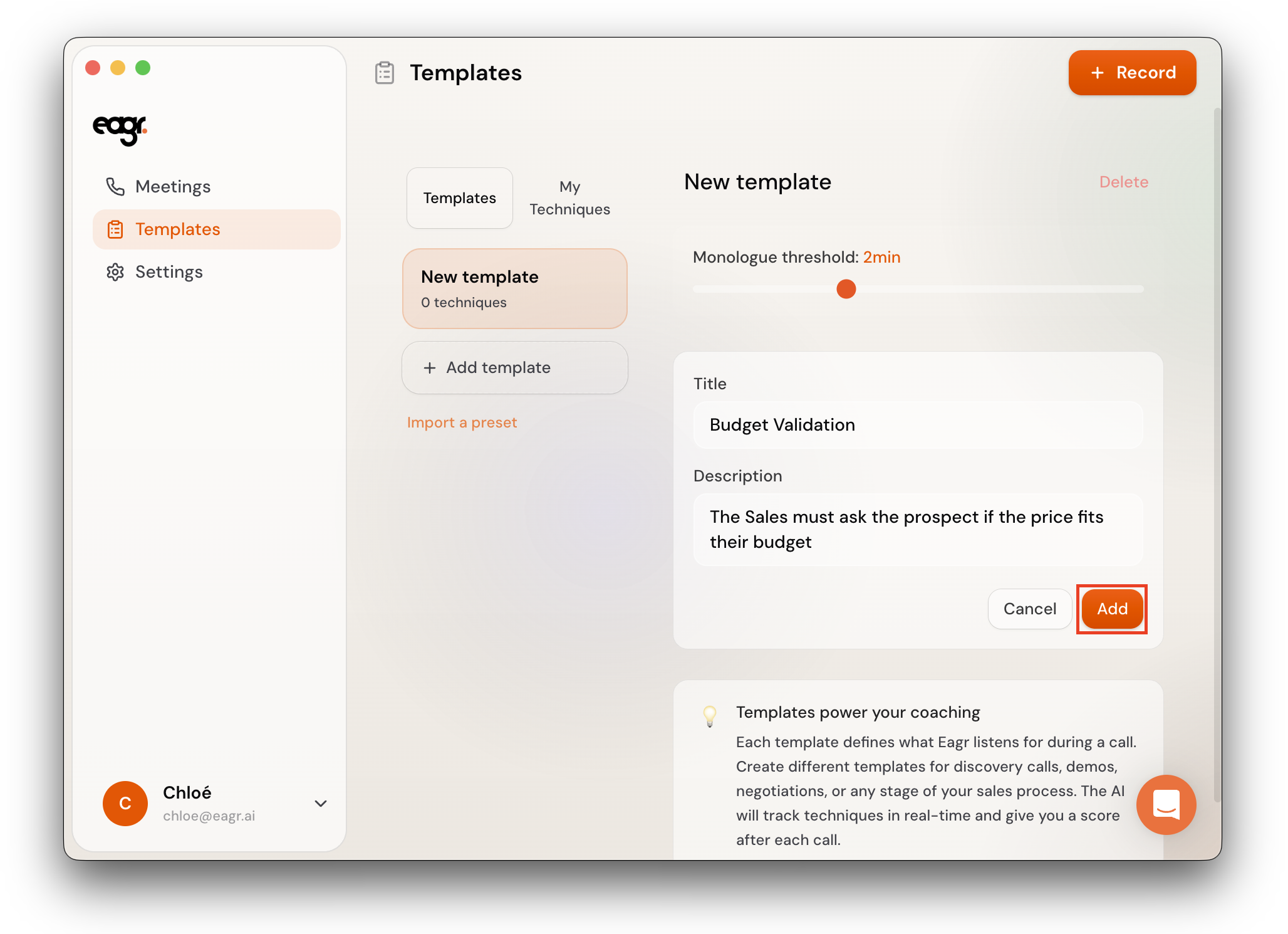 A template is a set of sales techniques that the Live Coach tracks during your calls. Each template defines what Eagr listens for — and you can create different templates for different types of calls (discovery, demo, negotiation, etc.).