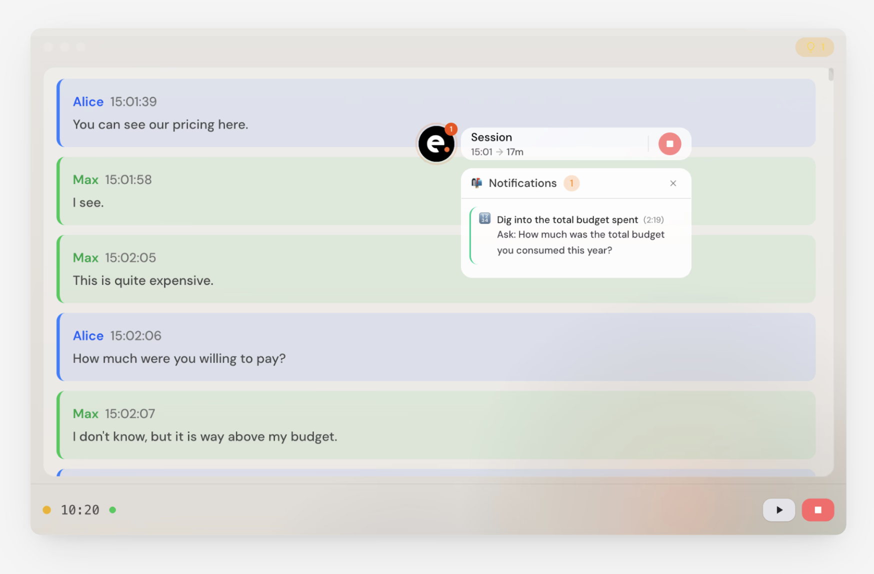 - Technique tracking — If you've selected a template (e.g. SPIN Selling, MEDDIC), the AI checks off each technique as you cover it.