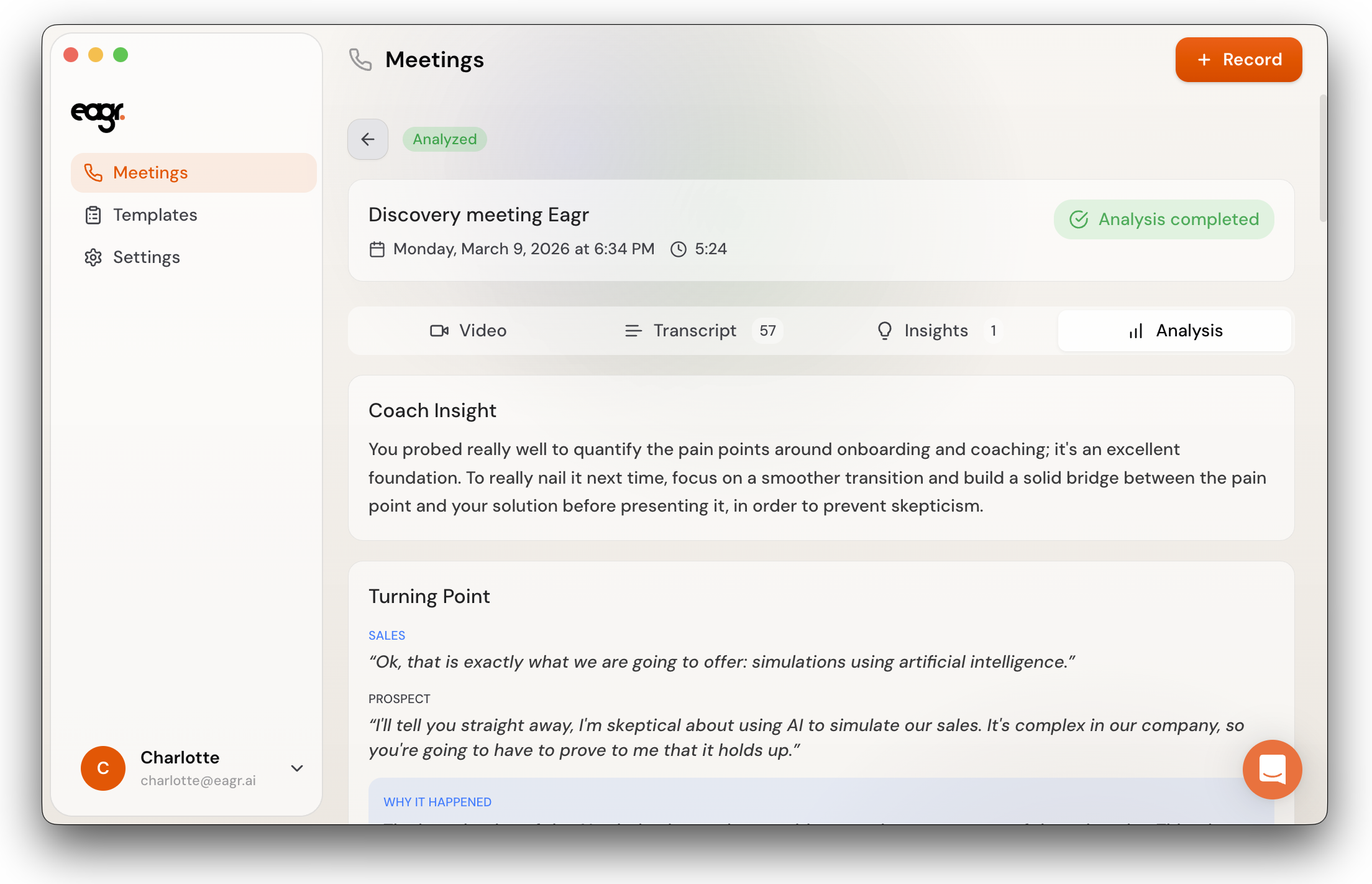 Once the call ends, the app uploads the recording and runs an analysis. You can find all your sessions in Meetings. Each session has four tabs: