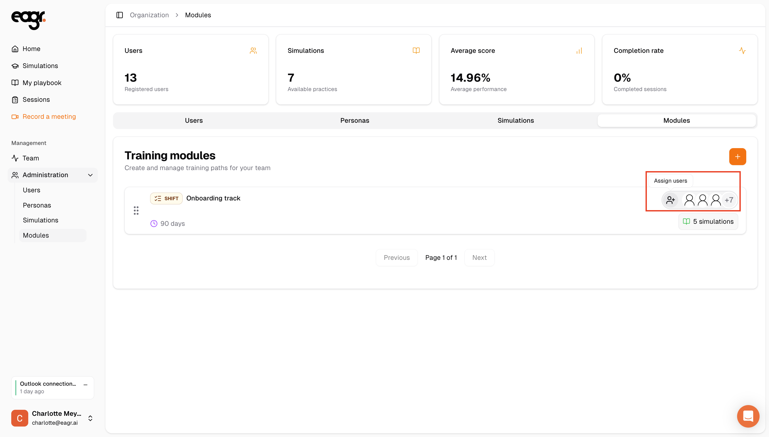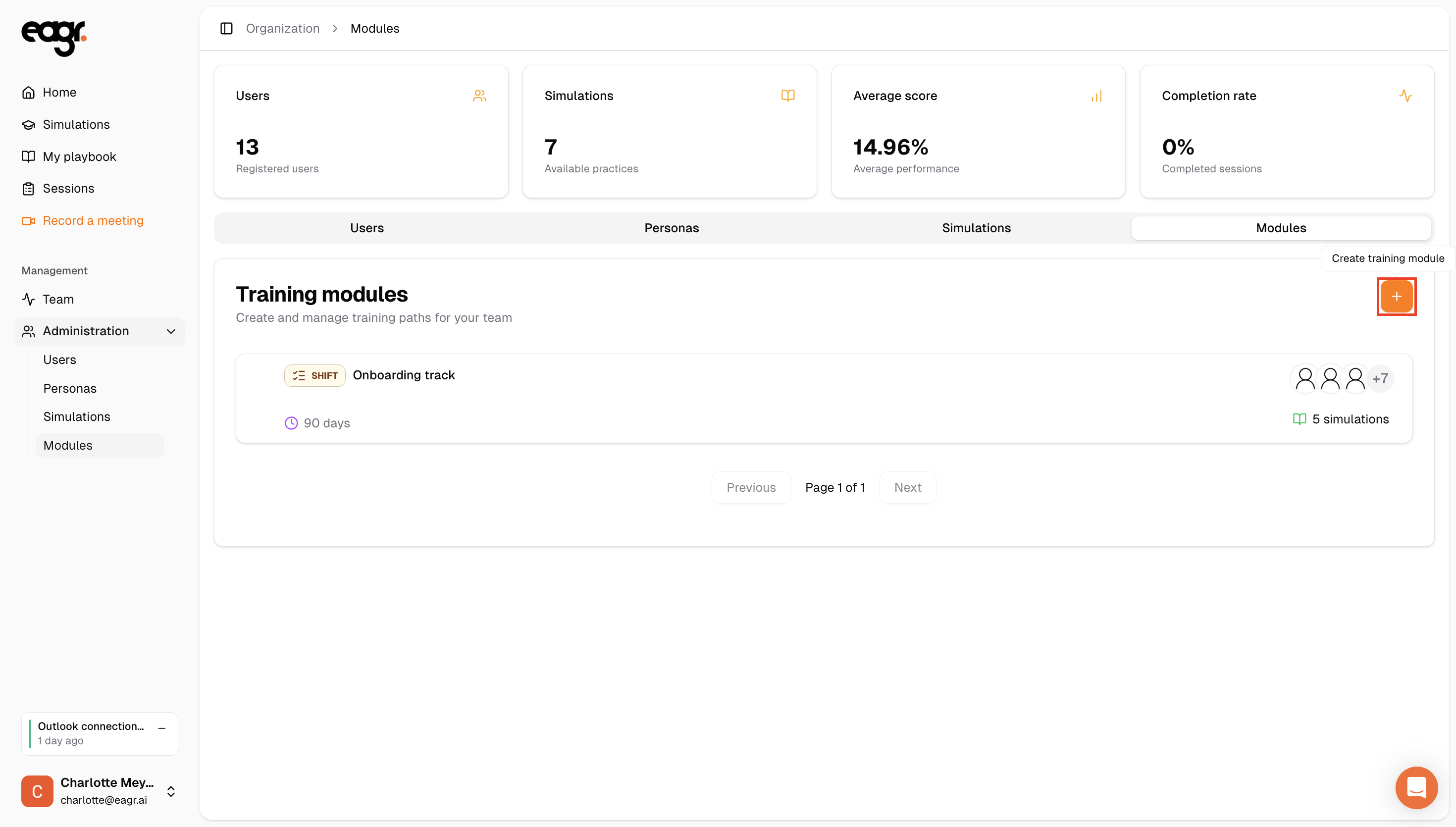 Go to Administration > Modules. This page shows an overview of your organization with four key metrics: Users, Simulations, Average score, and Completion rate.