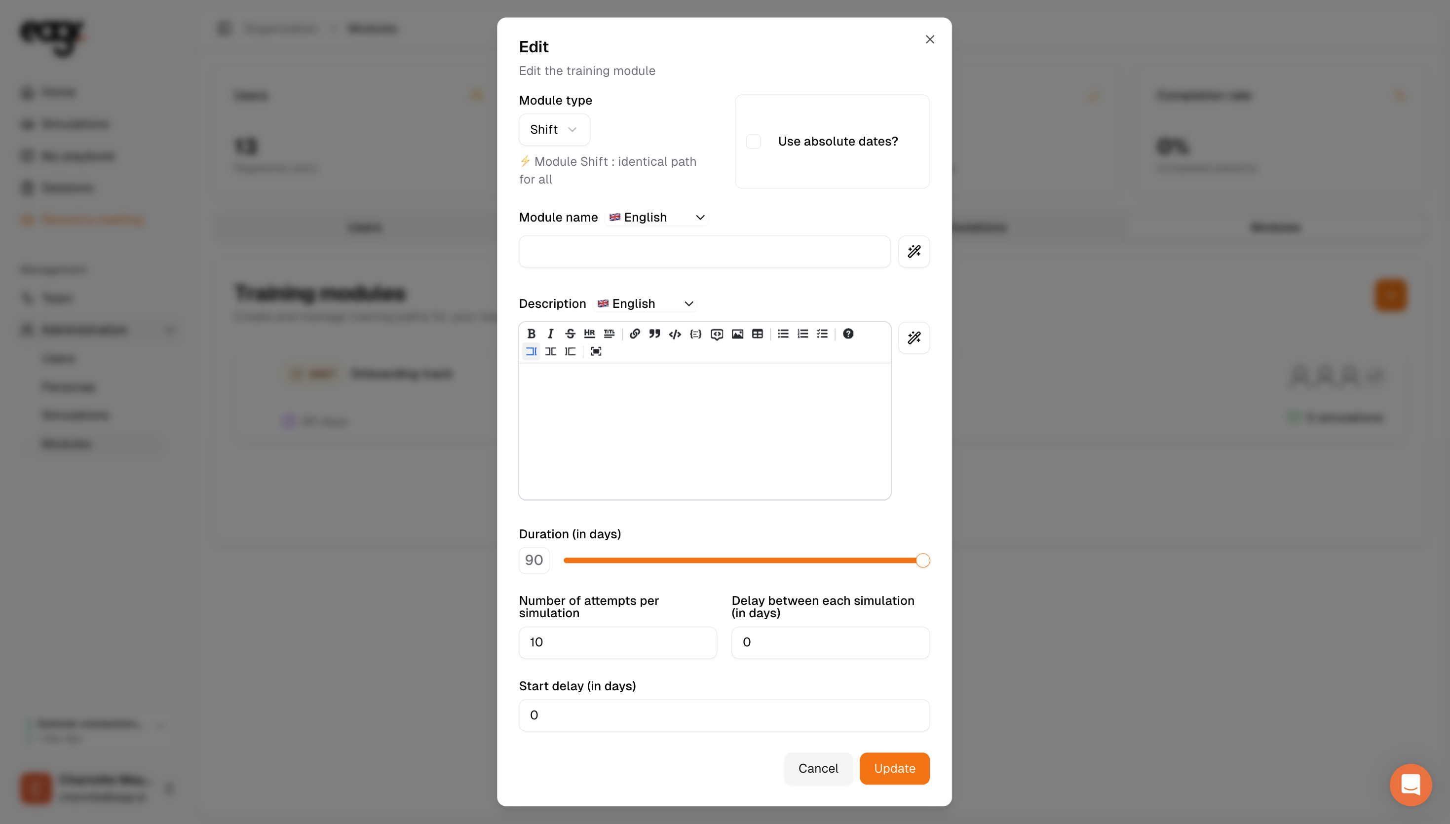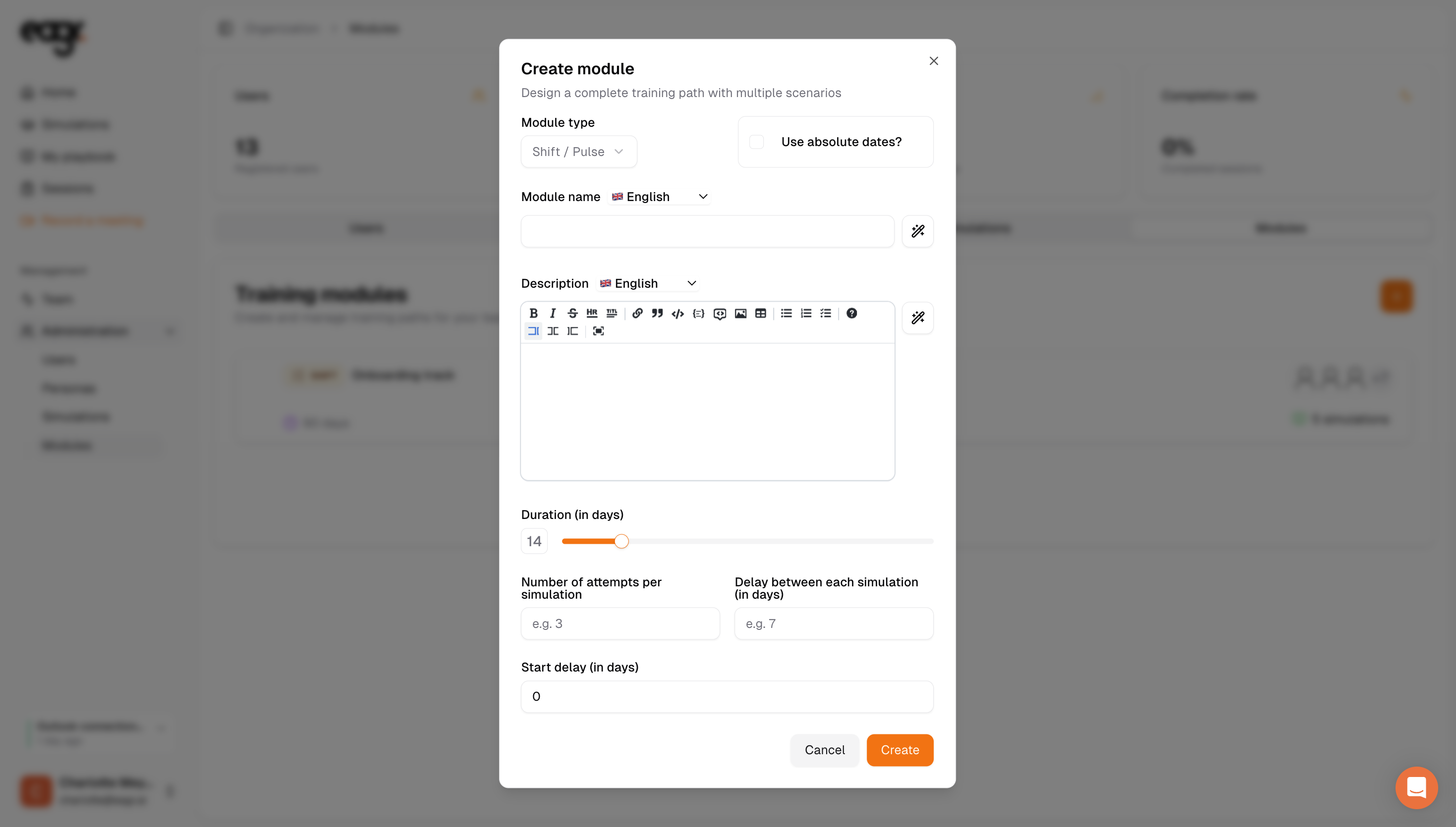 Click on the Modules tab to see all your training modules. Each module displays its type (Shift or Pulse), name, duration, number of simulations, and assigned users.
