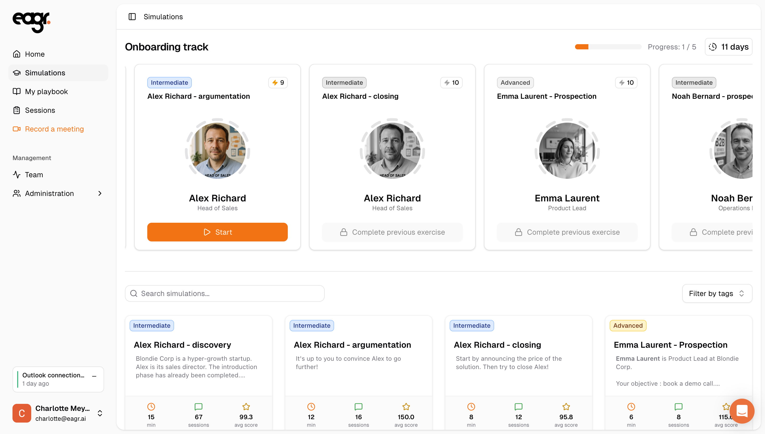 Each simulation is displayed as a card showing the persona name, the difficulty level, and the number of available attempts (⚡ icon, e.g. ⚡3 means 3 attempts).