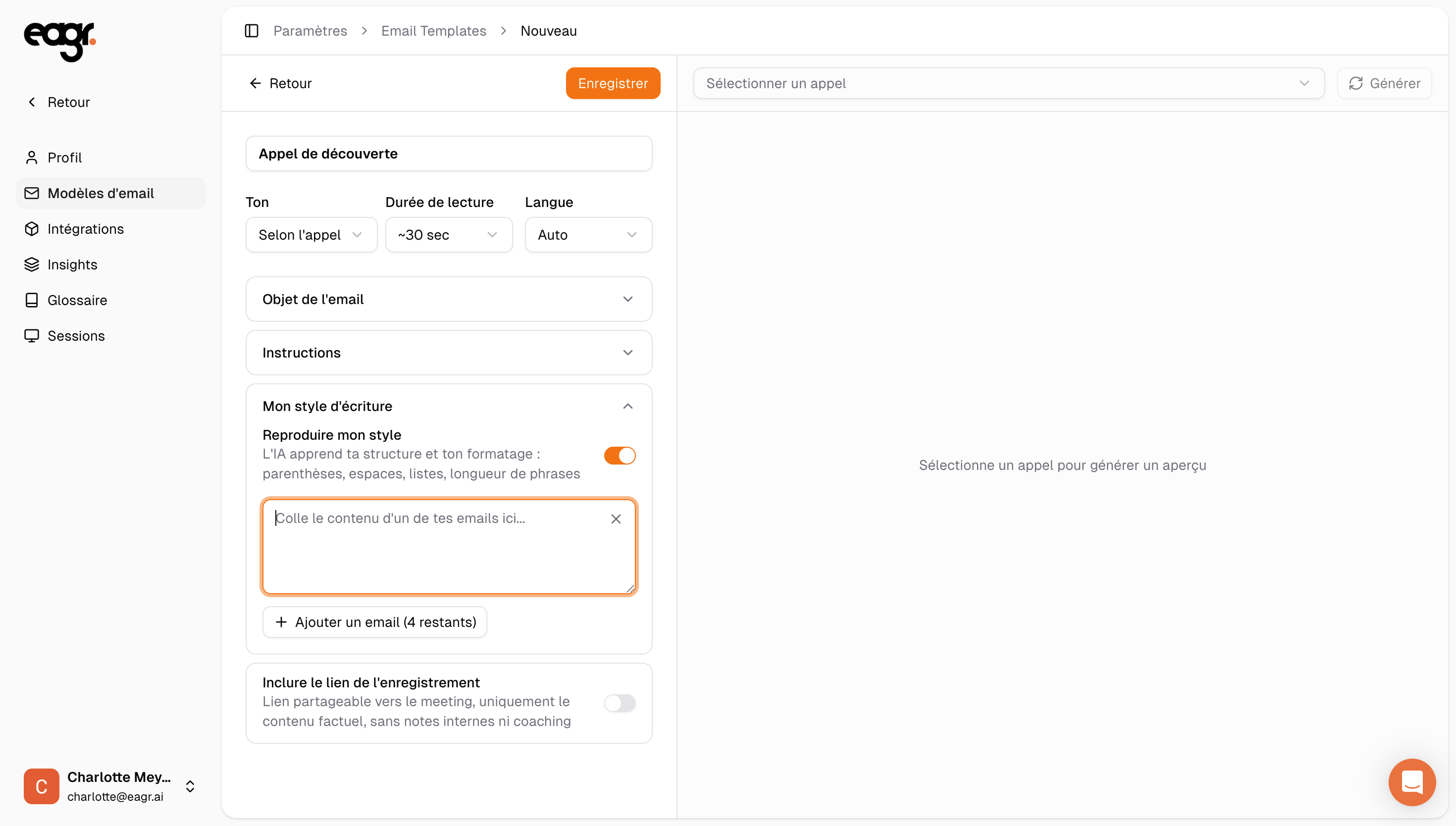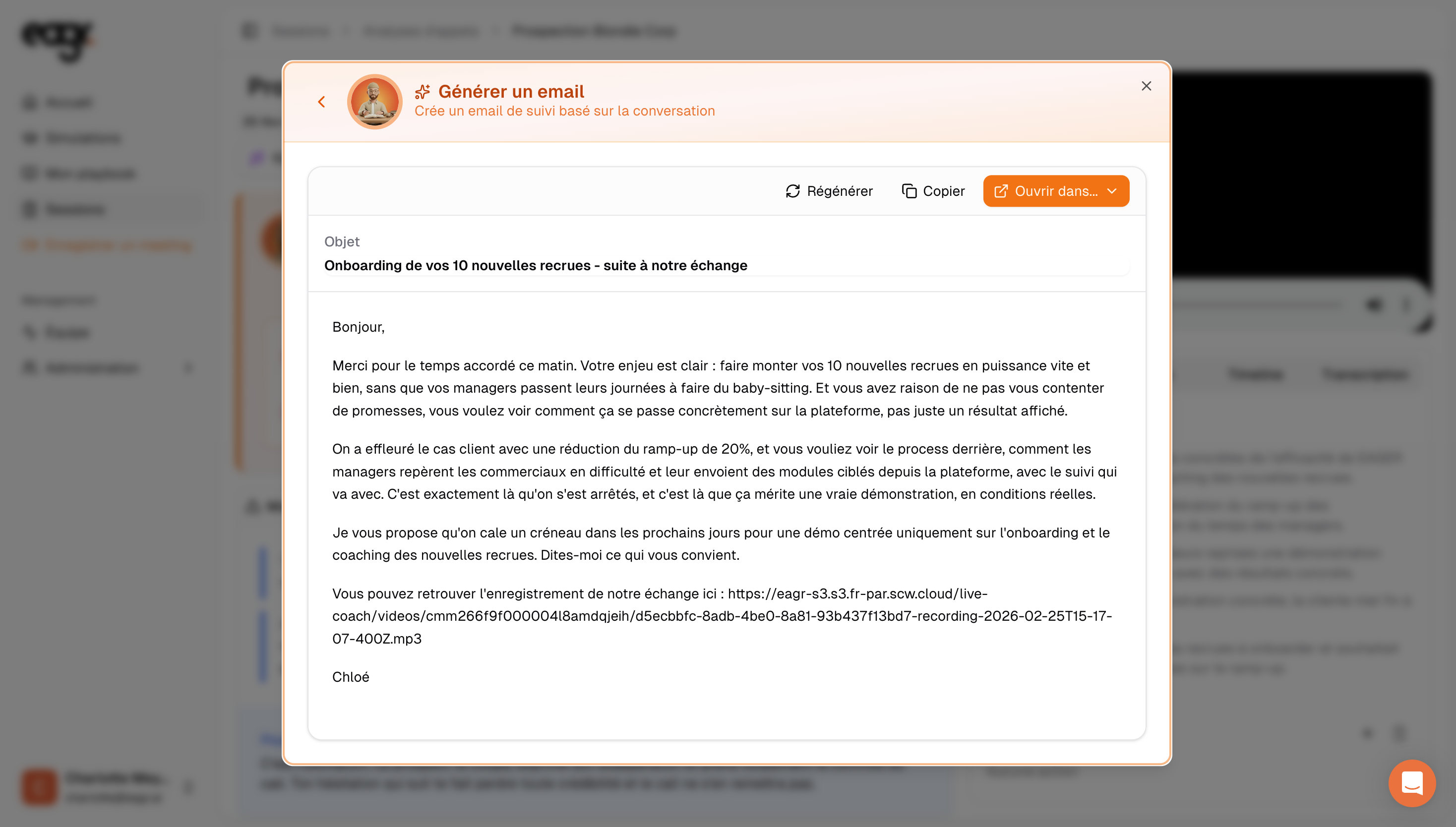 Après un appel, Eagr peut générer un email de suivi basé sur ta conversation. L'IA utilise la transcription pour rédiger un email personnalisé reprenant les points clés discutés et les prochaines étapes.