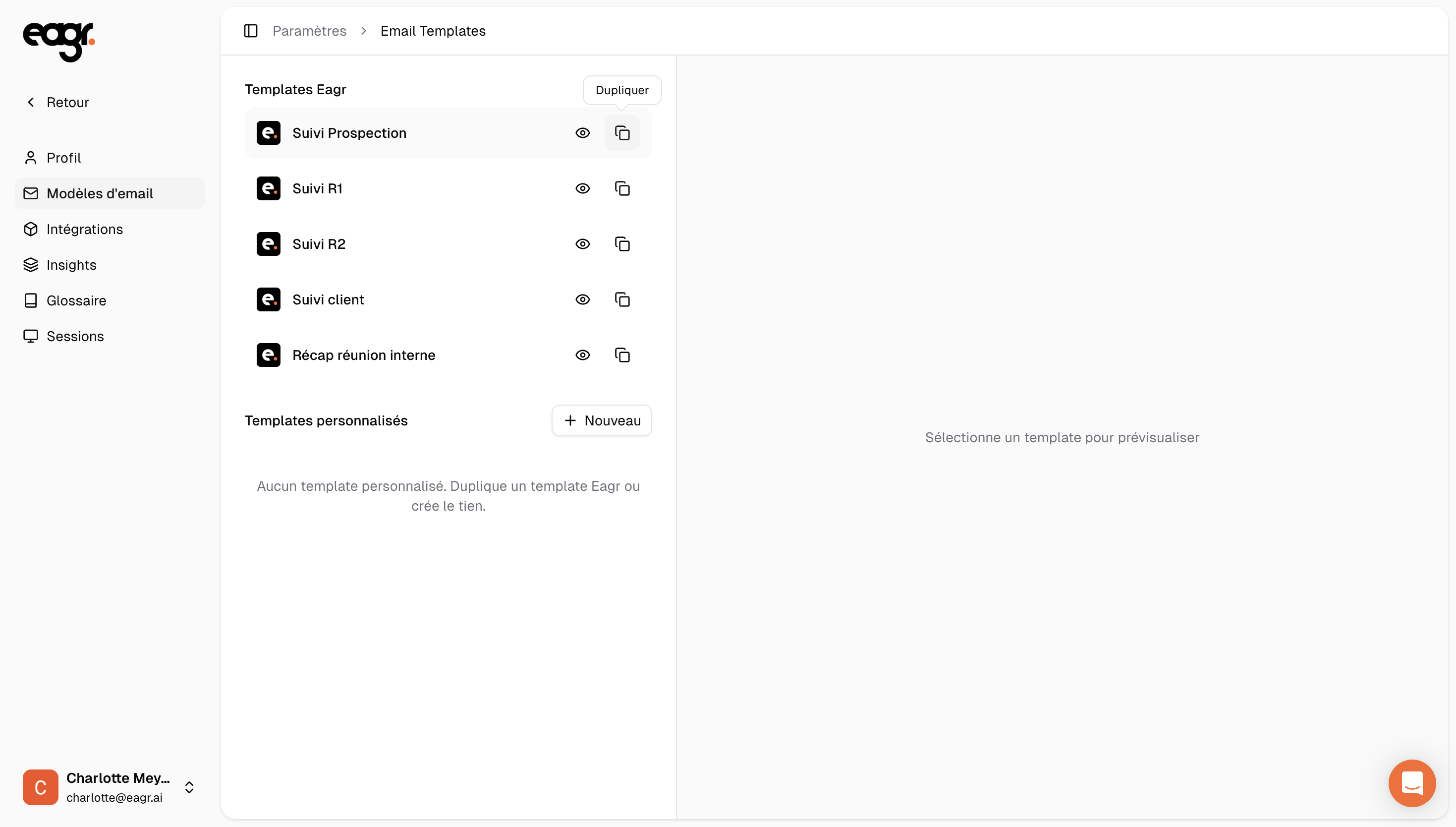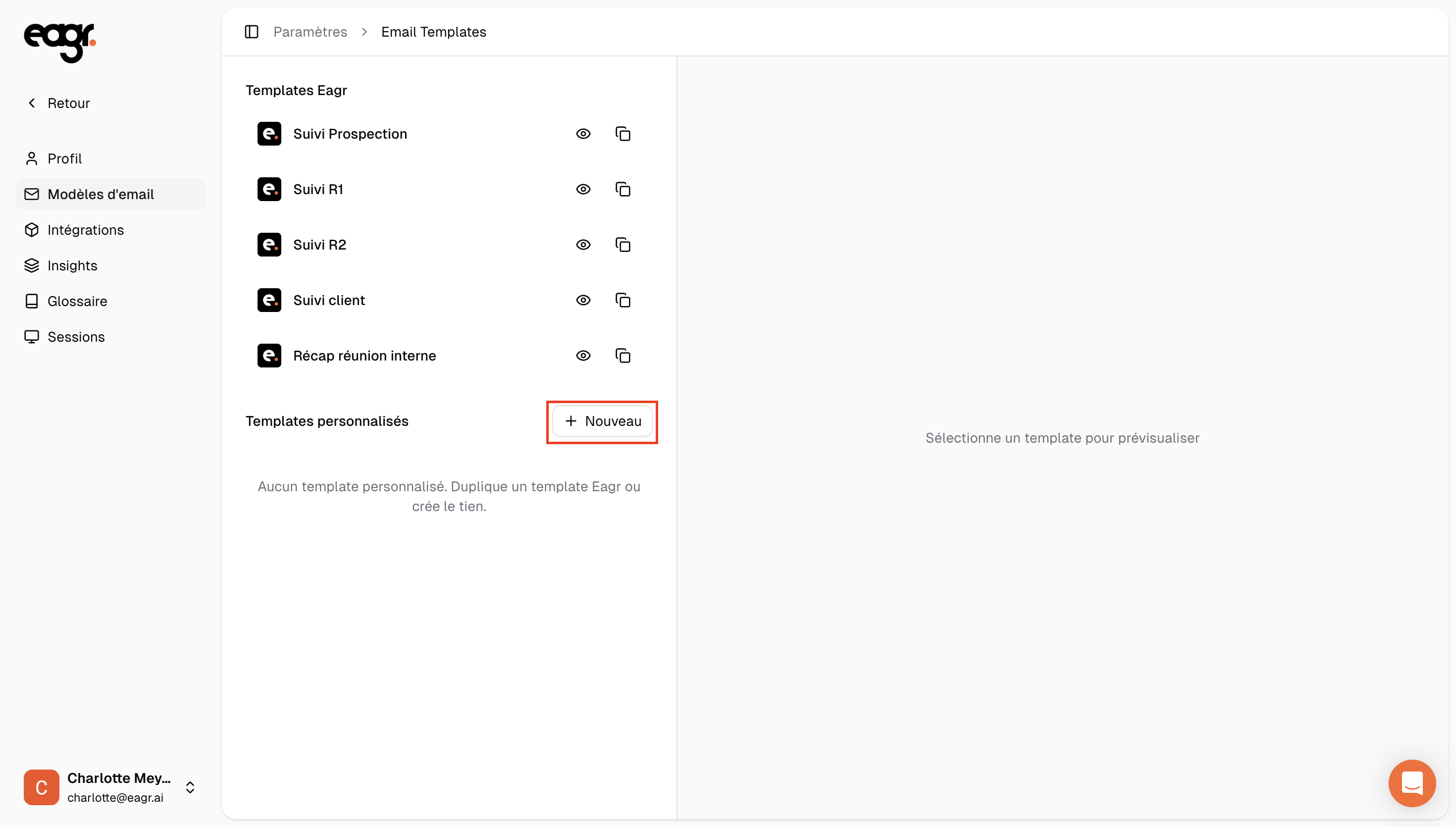 C'est ici que vivent tes modèles personnalisés. Clique sur Nouveau pour en créer un de zéro, ou duplique un modèle Eagr pour partir d'une base existante.