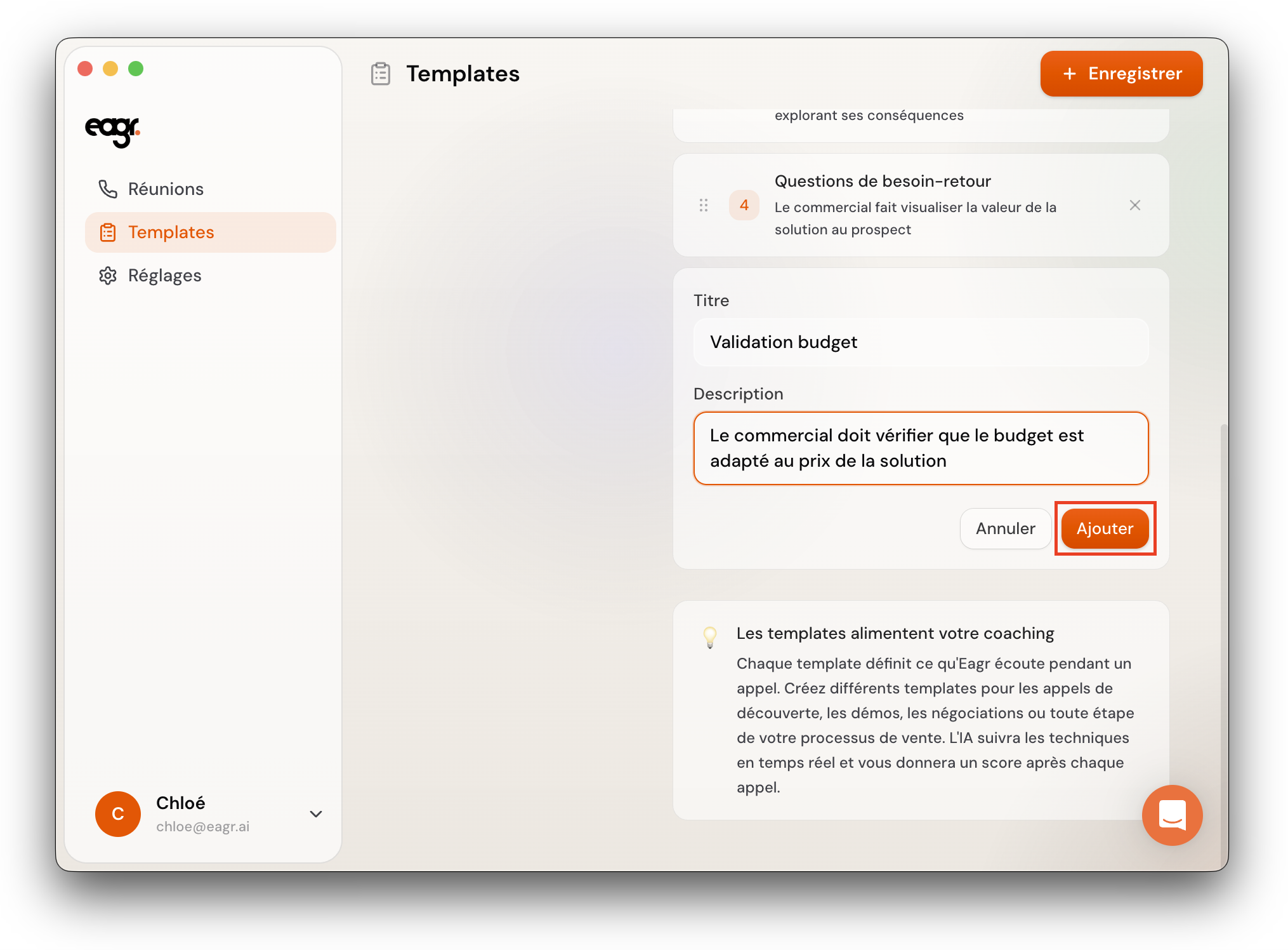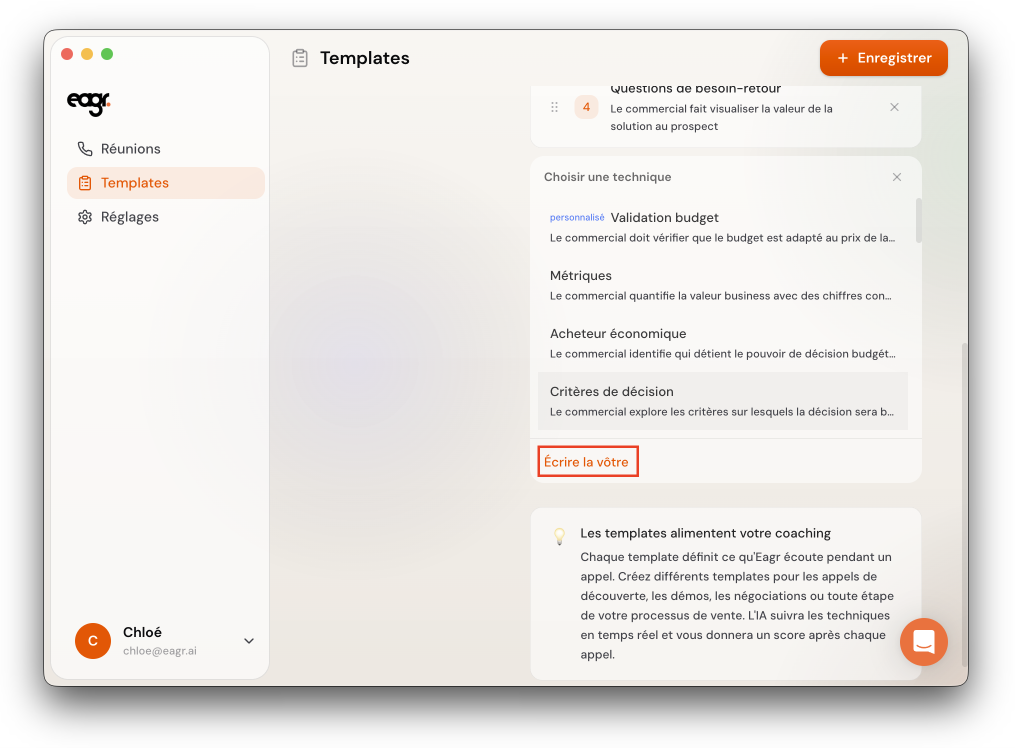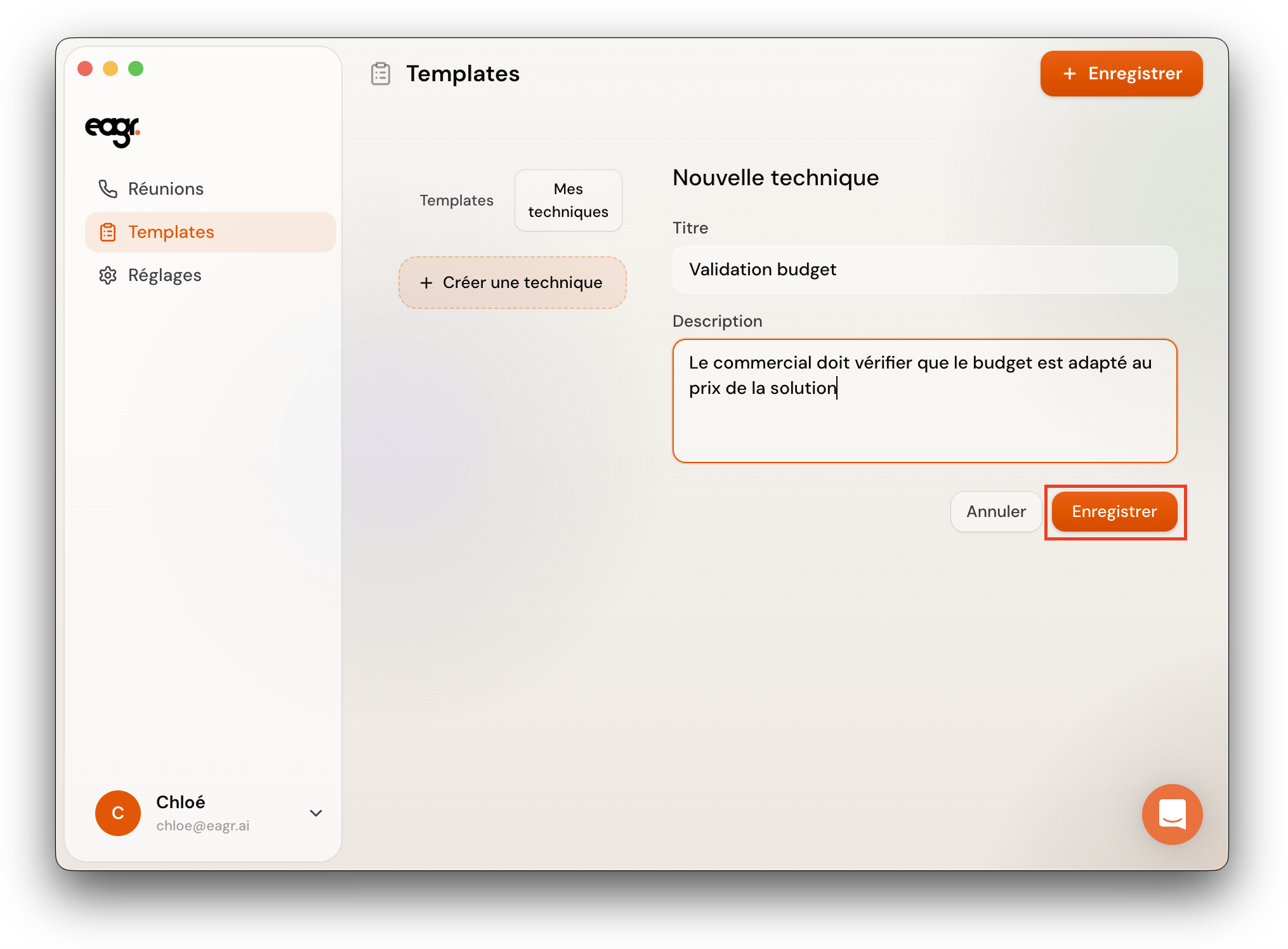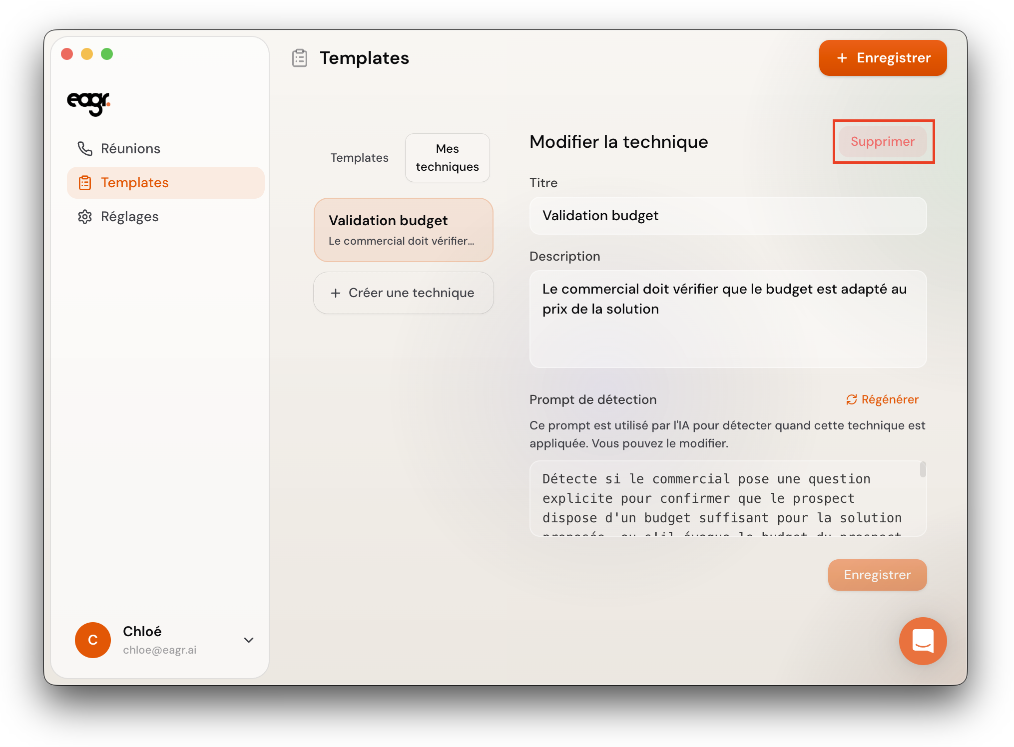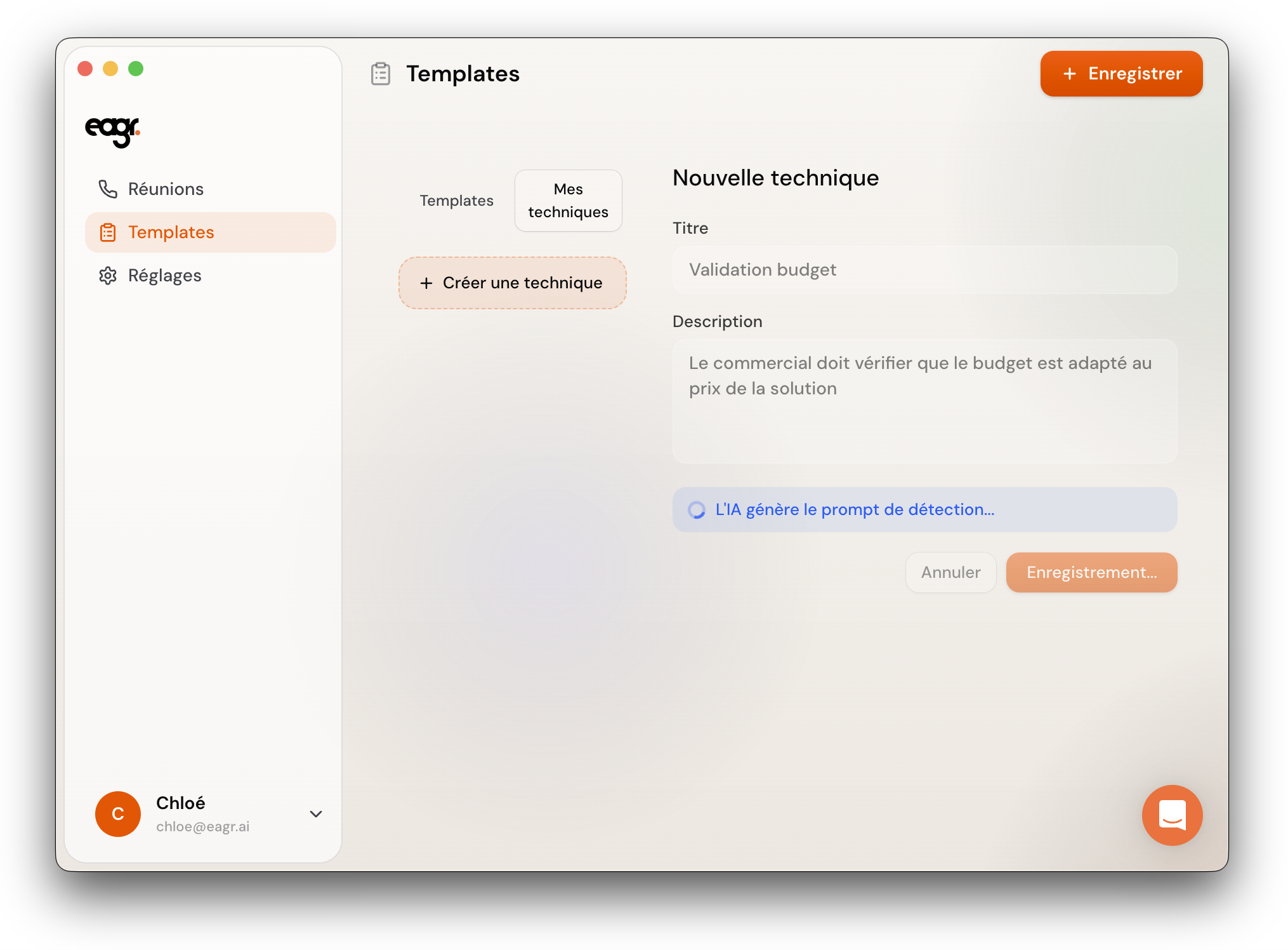 Chaque technique a un Titre, une Description et un prompt de détection qu’Eagr utilise pour déterminer si la technique a été couverte pendant la conversation.