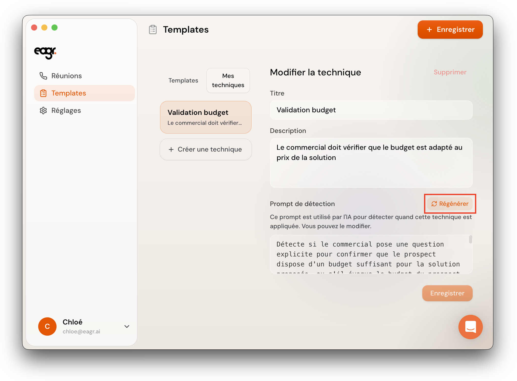 Tu peux aussi cliquer sur Régénérer à côté du prompt de détection pour qu’Eagr en génère un nouveau basé sur ta description.