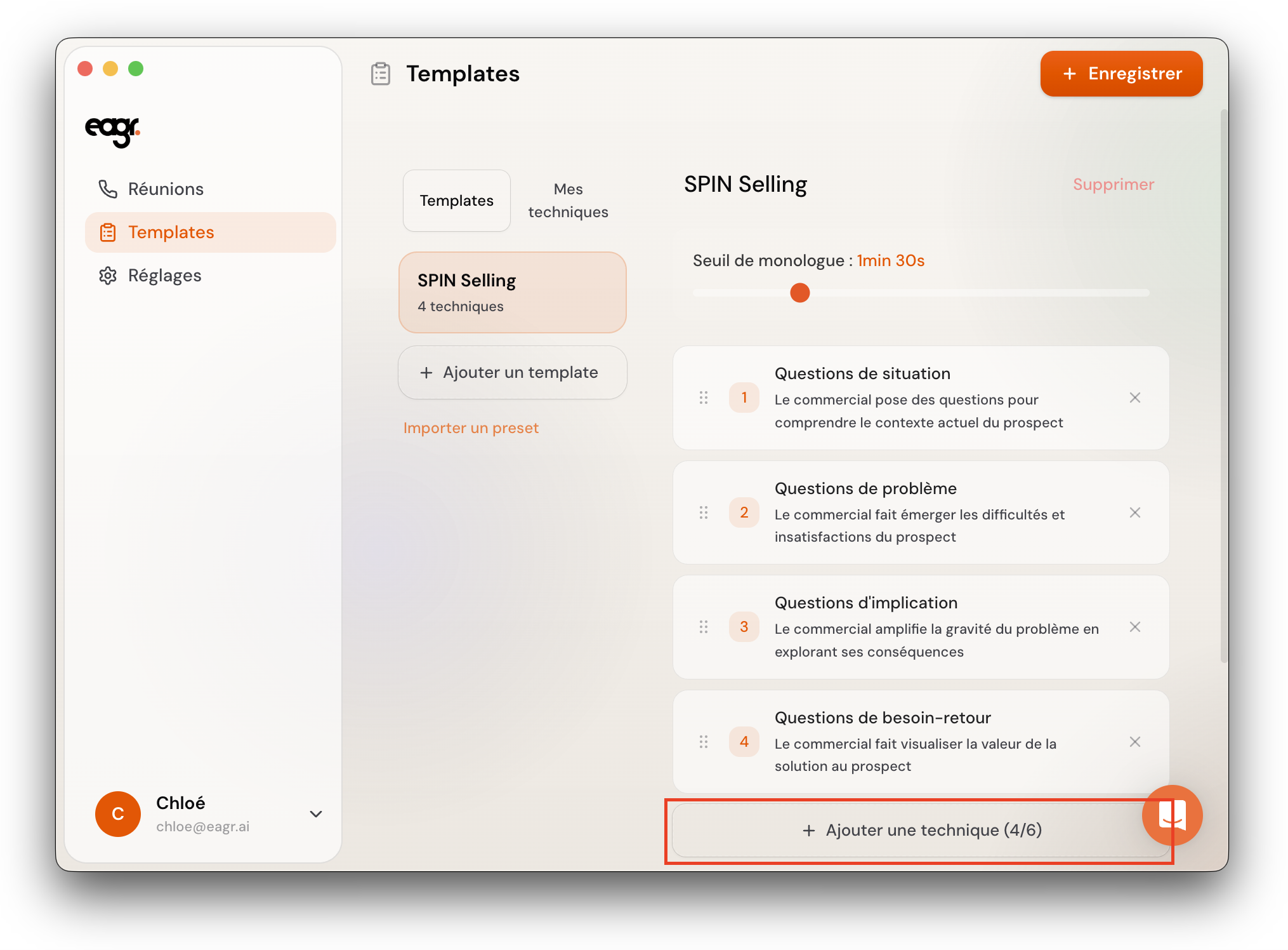 Les presets (MEDDIC, SPIN Selling, BANT, BEBEDC, SPICED) viennent avec des techniques préconfigurées. Mais tu peux aussi créer les tiennes pour coller à ton processus de vente.