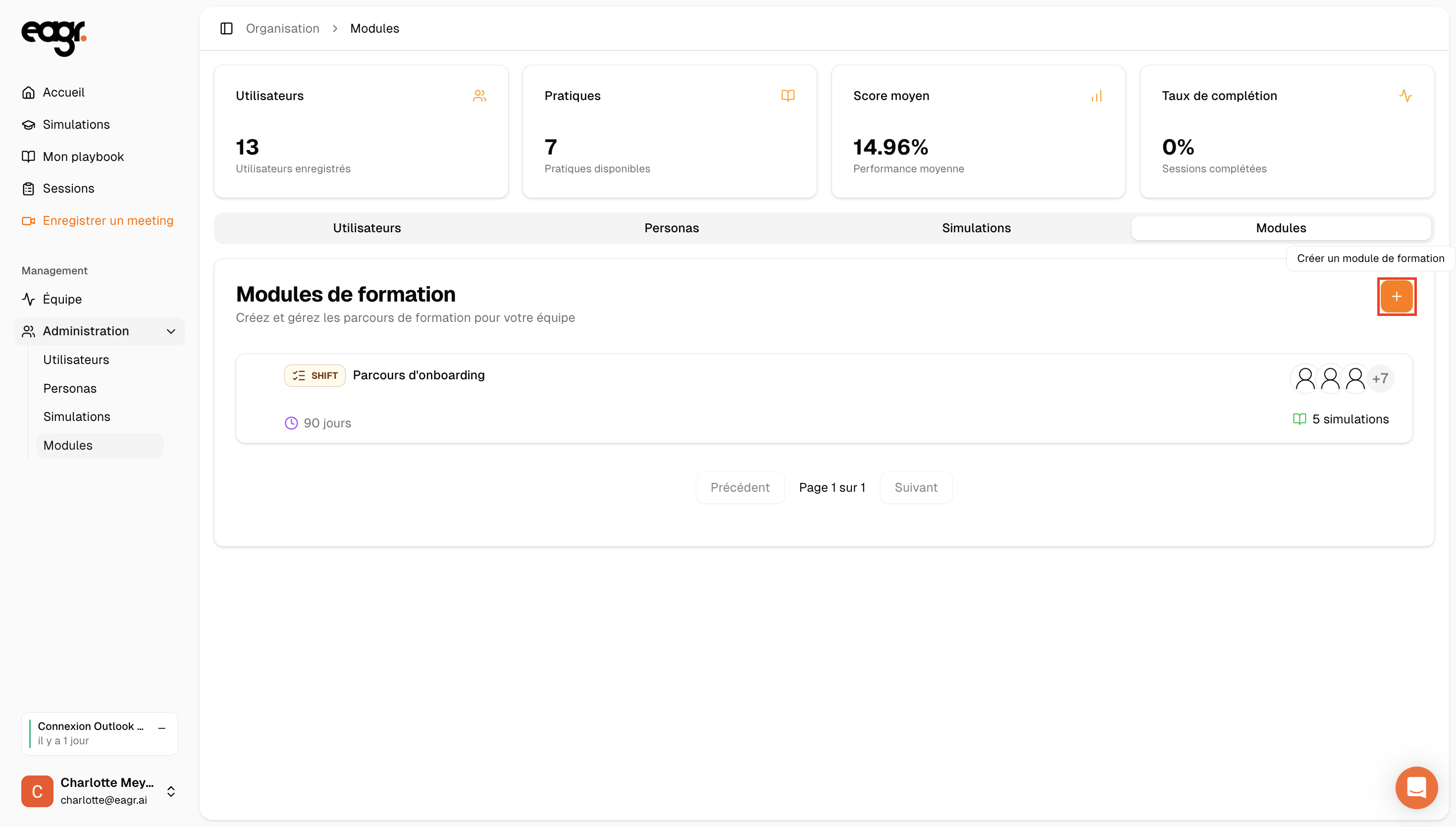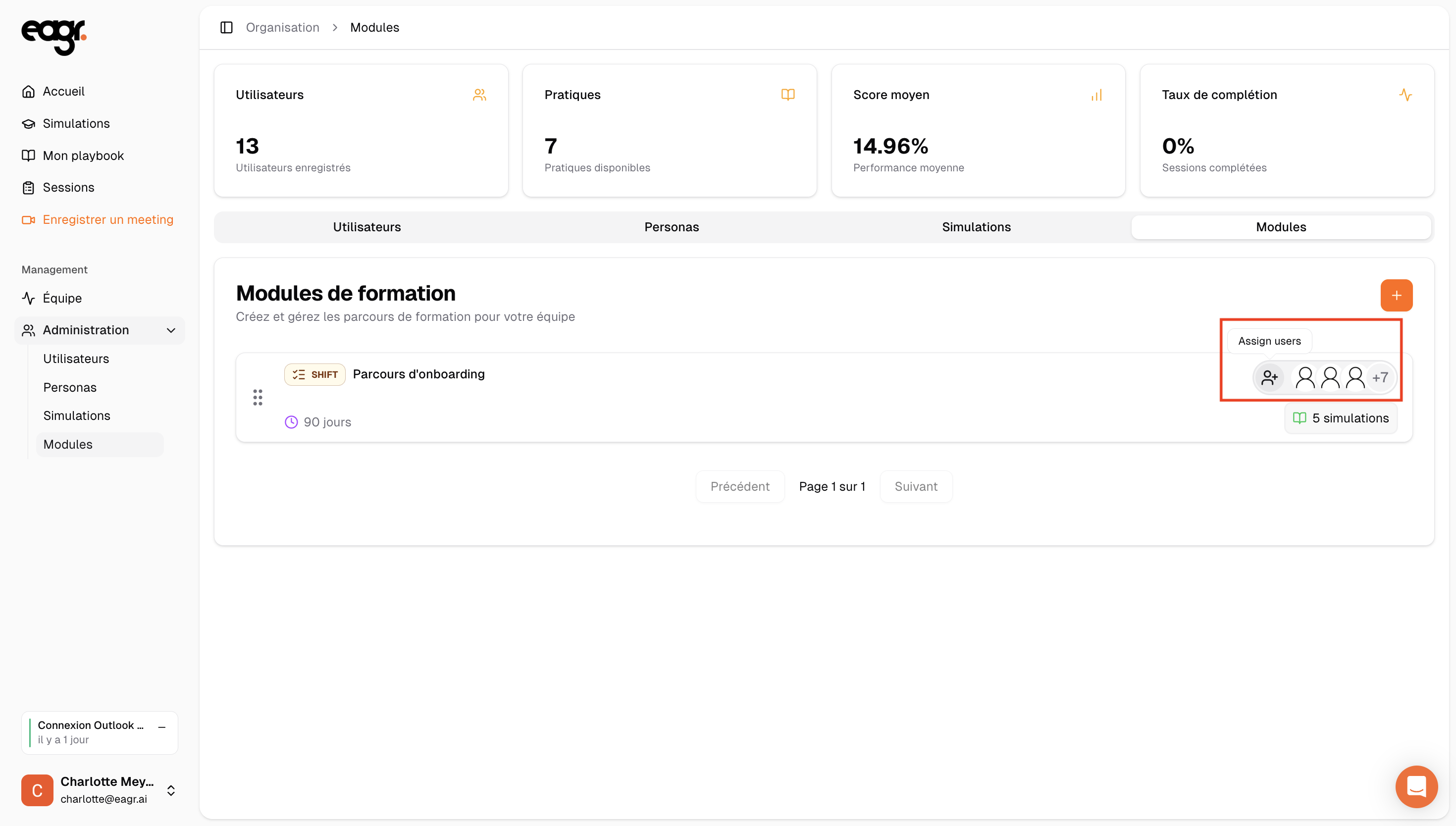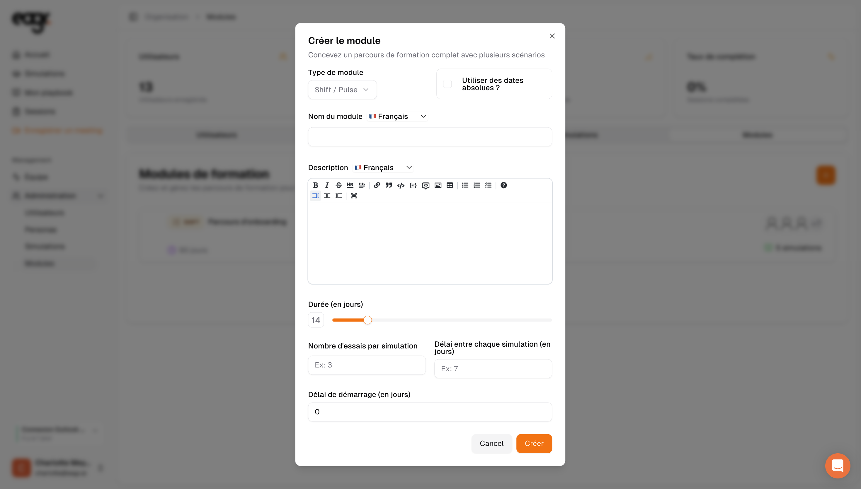 Clique sur l'onglet Modules pour voir tous tes modules de formation. Chaque module affiche son type (Shift ou Pulse), son nom, sa durée, le nombre de simulations et les utilisateurs assignés.