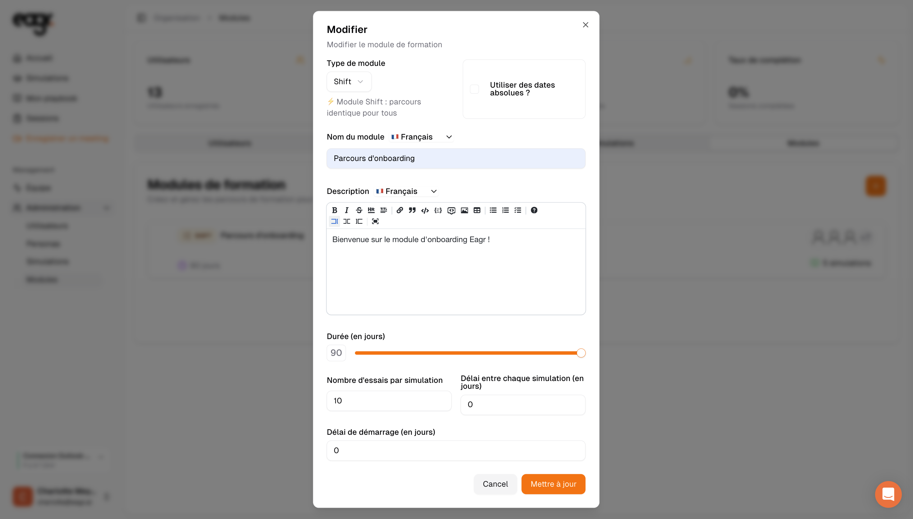 Sur la page Modules, clique sur un module pour ouvrir la fenêtre Modifier. Tu retrouves les mêmes champs que lors de la création. Ajuste les paramètres et clique sur Mettre à jour pour sauvegarder.