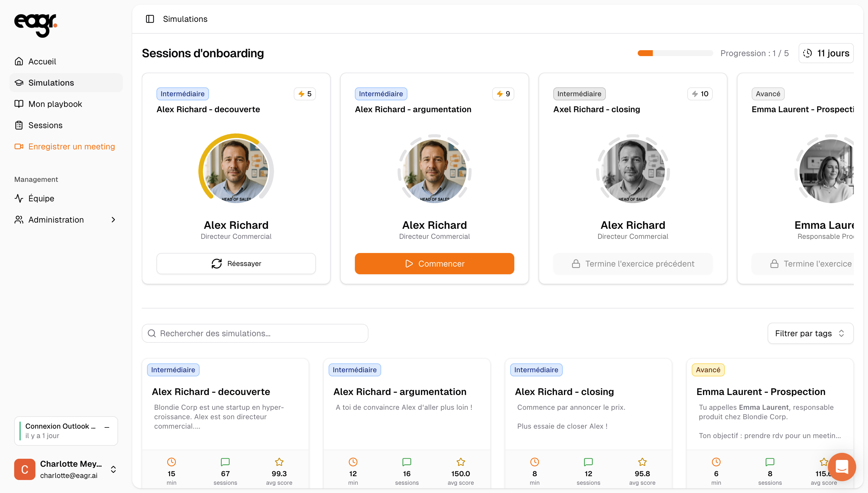 Chaque simulation est affichée sous forme de carte avec le nom du persona, le niveau de difficulté, et le nombre d'essais disponibles (icône ⚡, ex : ⚡3 = 3 essais).